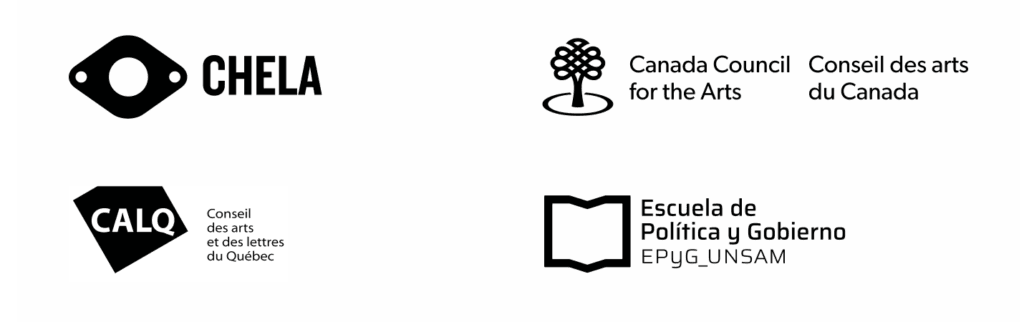 Agradecemos al Canada Council for the Arts y al Conseil des arts et des lettres du Québec por su apoyo a la exposición y a los programas públicos relacionados. Agradecemos al Consejo Nacional de Investigaciones Científicas y Técnicas (CONICET) y a la Escuela de Política y Gobierno de la UNSAM por compartir su conocimiento y co-organizar este evento. Asimismo, al equipo de cheLa por su apoyo y ser nuestros anfitriones.